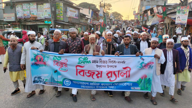 লালমোহনে বাংলাদেশ শ্রমিক কল্যাণ ফেডারেশনের উদ্যোগে বর্ণাঢ্য বিজয় র্যালি