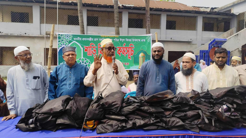 পত্নীতলায় প্রধানমন্ত্রীর ত্রাণ তহবিলের ৪শ শাড়ি বিতরণ করলেন এমপি এনামুল