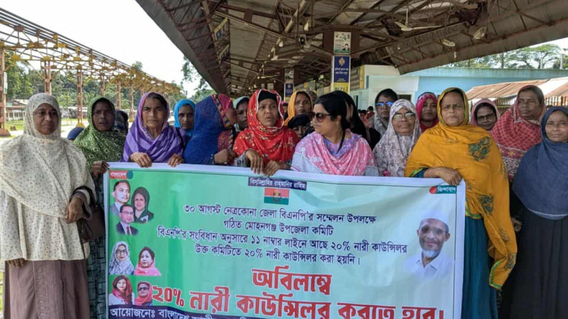 মোহনগঞ্জে উপজেলা বিএনপির কমিটিতে নারী কাউন্সিলর রাখার দাবীতে মহিলা দলের মানববন্ধন