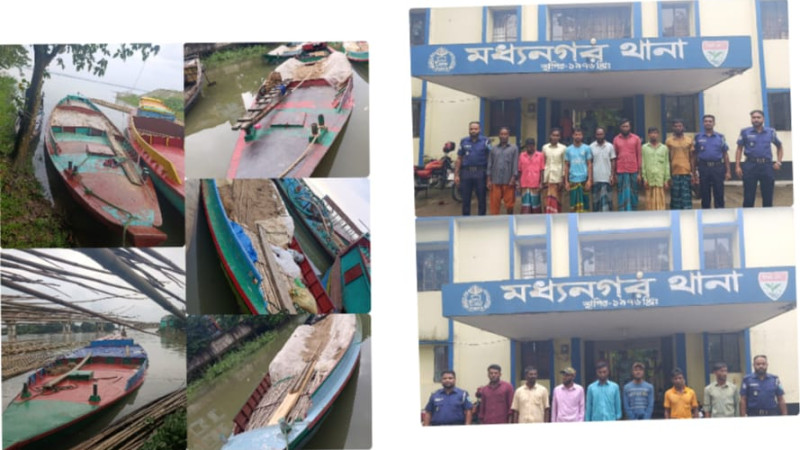 মধ্যনগরে অবৈধ বালু উত্তোলনে পুলিশের অভিযান: ৫টি নৌকা জব্দ, গ্রেপ্তার ১৫