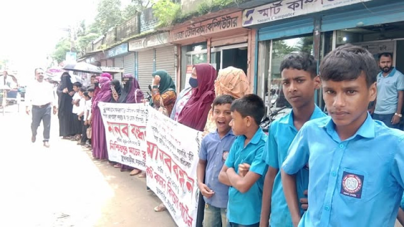 প্রাথমিক বৃত্তি পরীক্ষায় কিন্ডারগার্টেন স্কুলগুলোকে বাদ রাখার প্রতিবাদে ফুলবাড়ীয়ায় মানববন্ধন