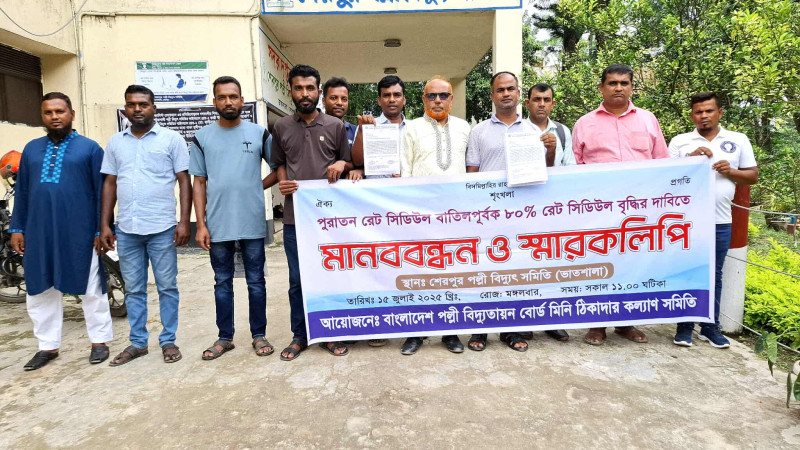 পুরাতন রেট বাতিল ও ৮০% বৃদ্ধির দাবিতে শেরপুরে পল্লী বিদ্যুৎ ঠিকাদারদের মানববন্ধন