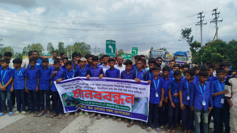 রায়গঞ্জে নিরাপদ সড়কের দাবিতে মহাসড়ক অবরোধ করে মানববন্ধন