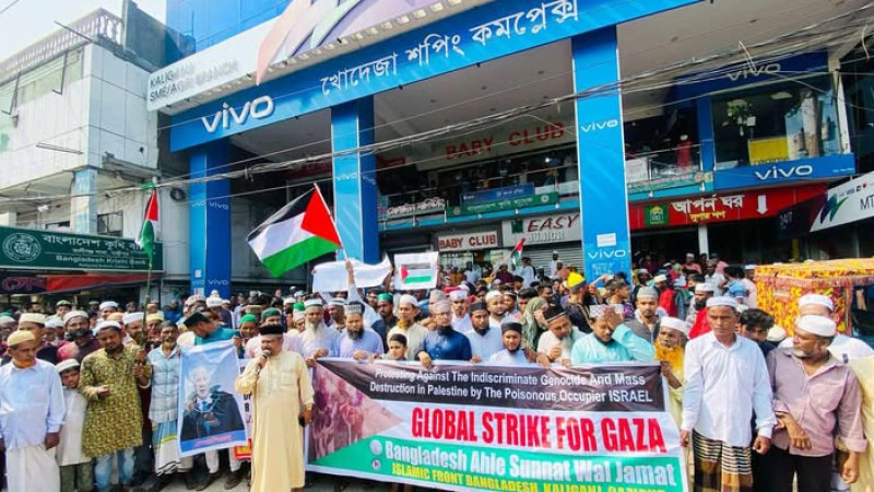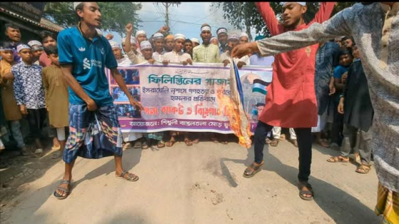 ইসরাইয়েলি পতাকা পুড়িয়ে গাজায় নৃশংস গণহত্যার প্রতিবাদে গুরুদাসপুরে বিক্ষোভ