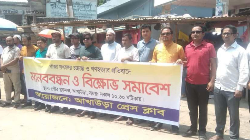 ফিলিস্তিনে গনহত্যার প্রতিবাদে আখাউড়া প্রেস ক্লাবের মানববন্ধন ও বিক্ষোভ সমাবেশ
