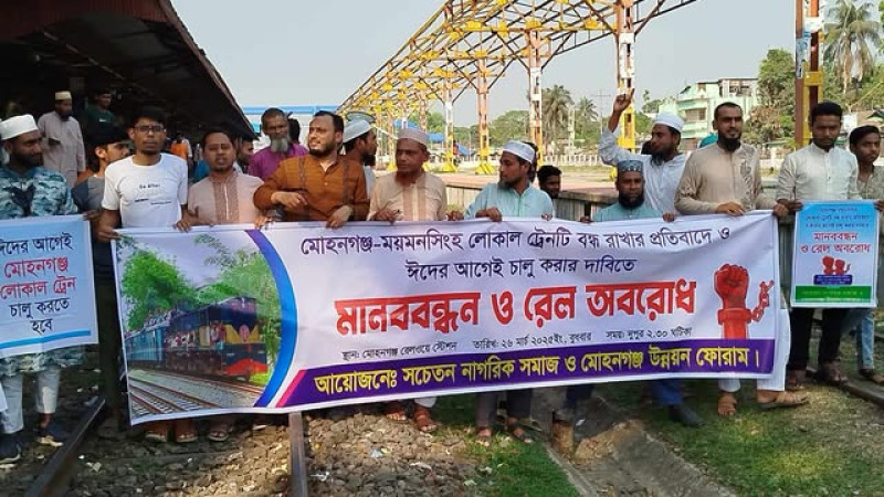 মোহনগঞ্জে বন্ধ লোকাল ট্রেন চালুর দাবিতে মানববন্ধন