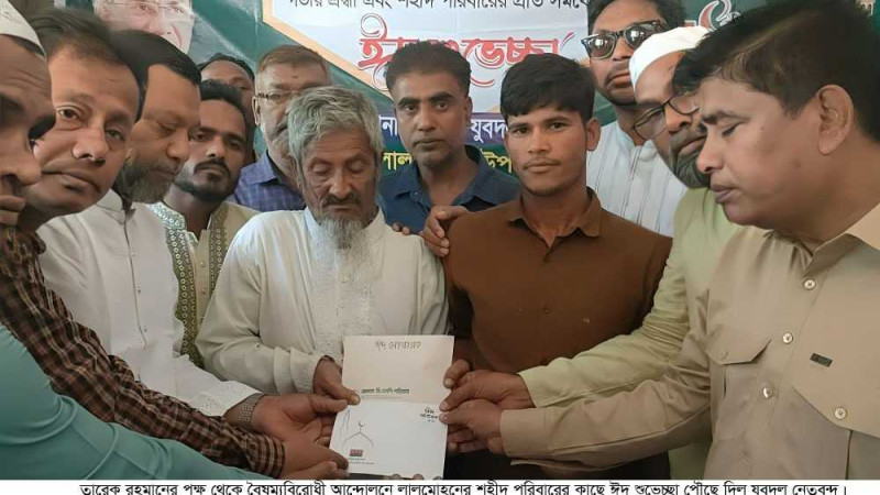 লালমোহনে তারেক রহমানের পক্ষ থেকে বৈষম্যবিরোধী আন্দোলনে শহীদ পরিবারের কাছে ঈদ শুভেচ্ছা পৌছে দিল যুবদল