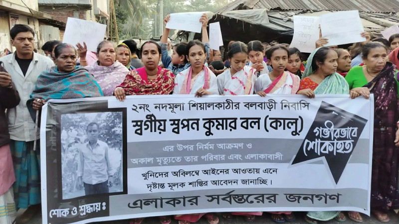 ভান্ডারিয়ায় স্বপন কুমার বল হত্যাকাণ্ডের সুষ্ঠু তদন্ত ও বিচার দাবিতে মানববন্ধন