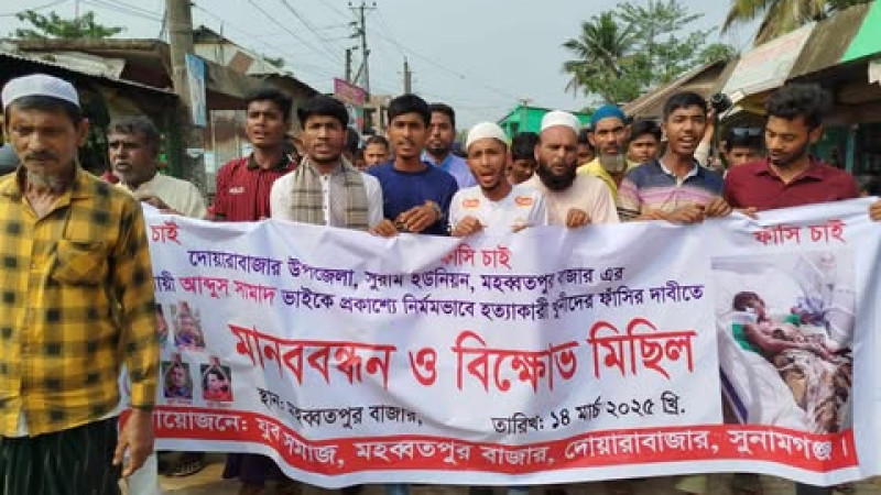 দোয়ারাবাজারে আব্দুস সামাদের হত্যাকারীদের ফাঁসি'র দাবিতে এলাকাবাসীর মানববন্ধন