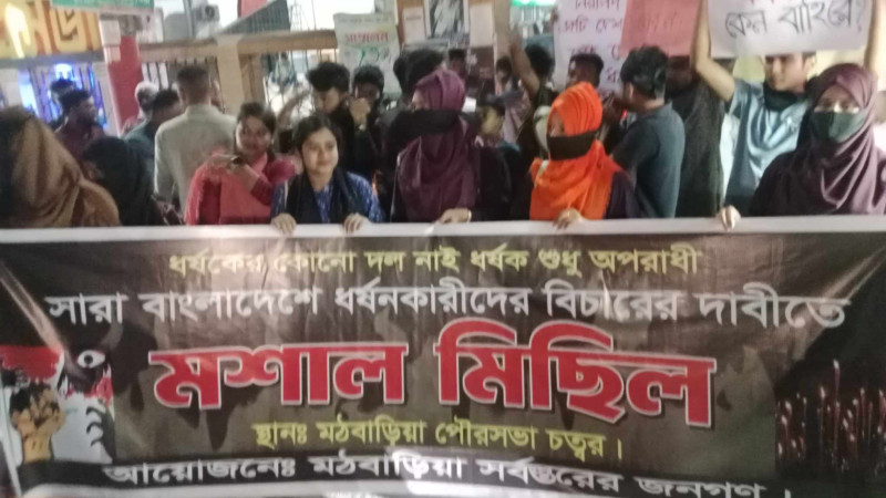 মঠবাড়িয়ায় সারা বাংলাদেশে ধর্ষনকারীদের বিচারের দাবিতে মশাল মিছিল