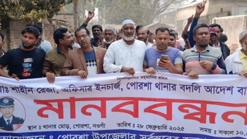 পোরশা থানা ওসির বদলী স্থগিতের দাবিতে মান্ববন্ধন অনুষ্ঠিত