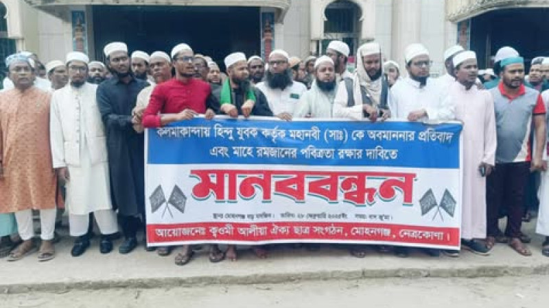 নবীজির কটুক্তিকারী সুপ্ত সাহাকে গ্রেফতারের দাবিতে মোহনগঞ্জে মানববন্ধন