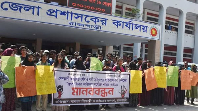 রাজবাড়ীতে ধর্ষণ ও নারী সহিংসতার বিরুদ্ধে সাধারণ শিক্ষার্থীদের মানববন্ধন