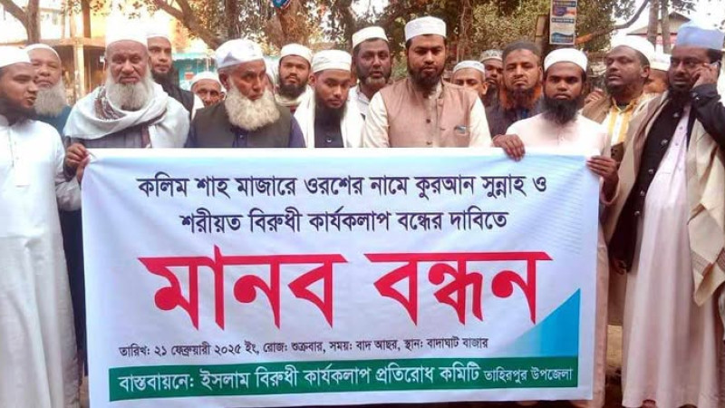 তাহিরপুরে হযরত শাহ(রহ.)মাজারে ওরশ বন্ধের দাবিতে মানববন্ধন