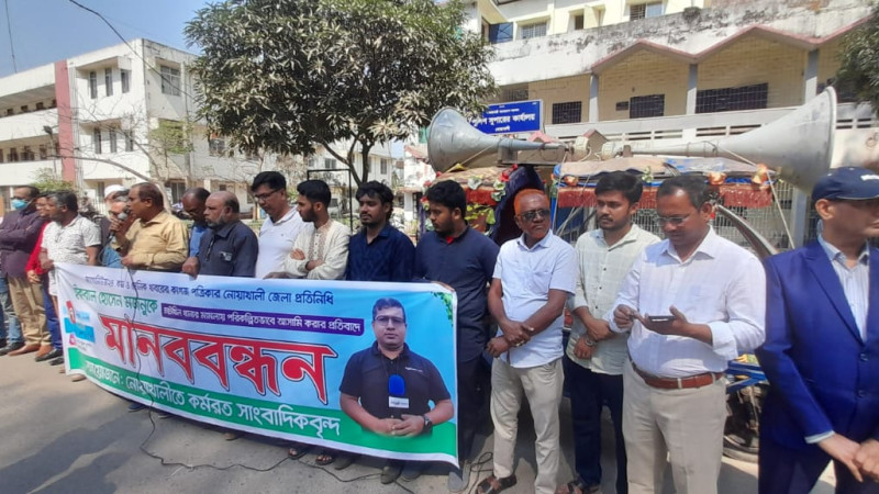 নোয়াখালীতে সাংবাদিকের বিরুদ্ধে মিথ্যা মামলার প্রতিবাদে মানববন্ধন
