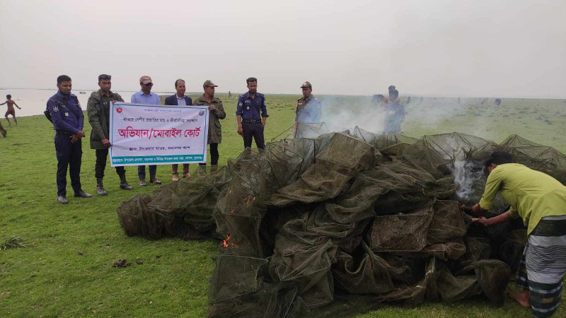 টাংগুয়ার হাওরে অভিযান,১লাখ টাকার অবৈধ জাল জব্দ