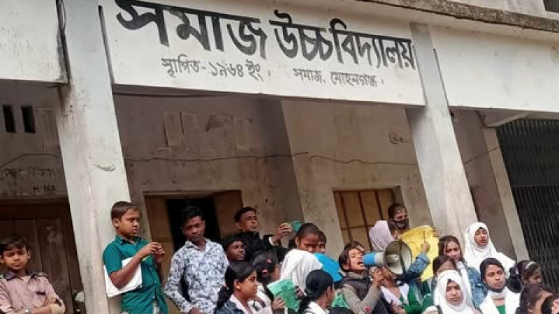 মোহনগঞ্জে শিক্ষক হাদিছ উদ্দিনের 'পদত্যাগ' দাবীতে শিক্ষার্থীদের বিক্ষোভ