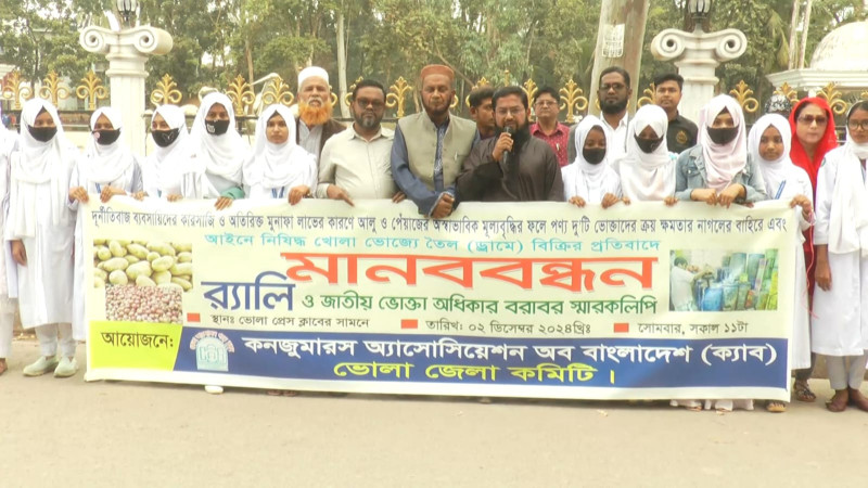ভোলায় নিত্যপ্রয়োজনীয় পণ্যের অস্বাভাবিক মূল্যবৃদ্ধির প্রতিবাদে মানববন্ধন