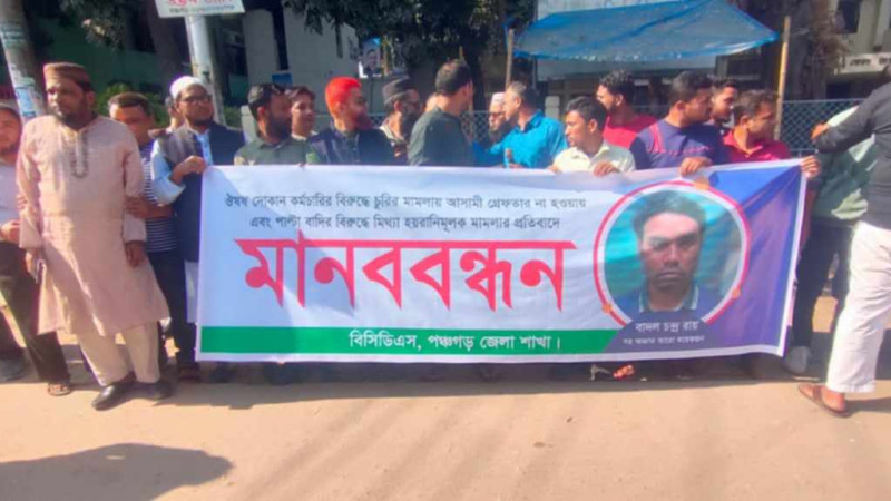 দোকান বন্ধ রেখে পঞ্চগড়ে ঔষুধ ব্যবসায়ীদের মানববন্ধন
