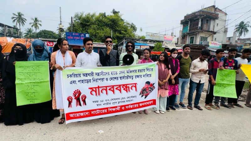 কক্সবাজারে সেনা হত্যার বিচার ও পাহাড়ের নিরাপত্তার দাবিতে নাটোরে মানববন্ধন