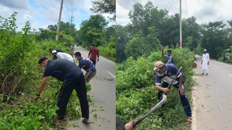বড়লেখায় সামাজিক সংগঠন এসোসিয়েশনে উদ্যোগে স্বেচ্ছাশ্রমে বড়লেখা-চান্দগ্রাম রাস্তার পাশের ঝোপঝাড় পরিস্কার
