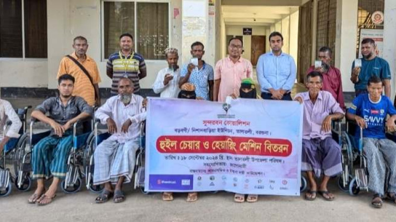 তালতলীতে প্রতিবন্ধীদের মাঝে হুইলচেয়ার ও হেয়ারিং ডিভাইস বিতরণ