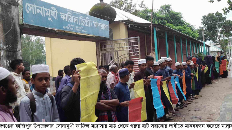 কাজিপুরে মাদ্রাসা মাঠ থেকে গরুর হাট সরানোর দাবীতে মাদ্রাসা শিক্ষার্থীদের মানববন্ধন