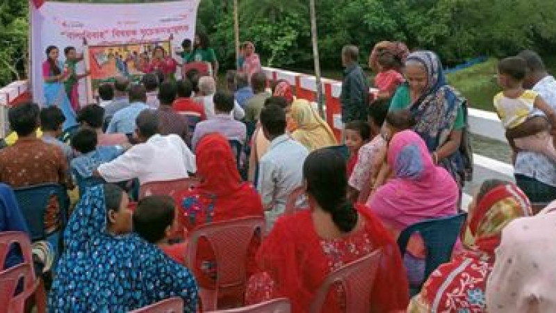 রামপালে প্রাচীন মাধ্যম পট গানে বাল্যবিবাহের কুফল সম্পর্কে শিক্ষা নিচ্ছেন গ্রামের নানা বয়সী মানুষেরা