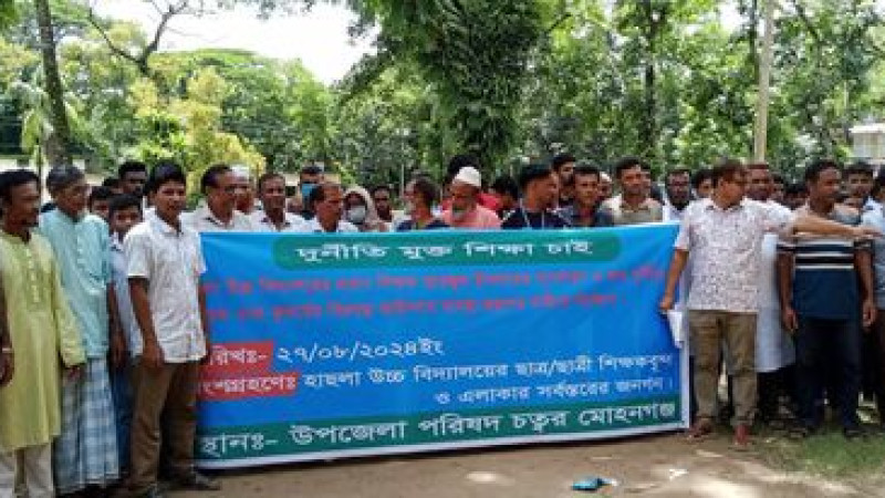 মোহনগঞ্জে প্রধান শিক্ষকের পদত্যাগের দাবীতে মানববন্ধন