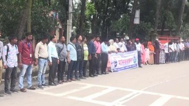 সাংবাদিকের বিরুদ্ধে করা মিথ্যা মামলা প্রত্যাহারের দাবিতে মানববন্ধন