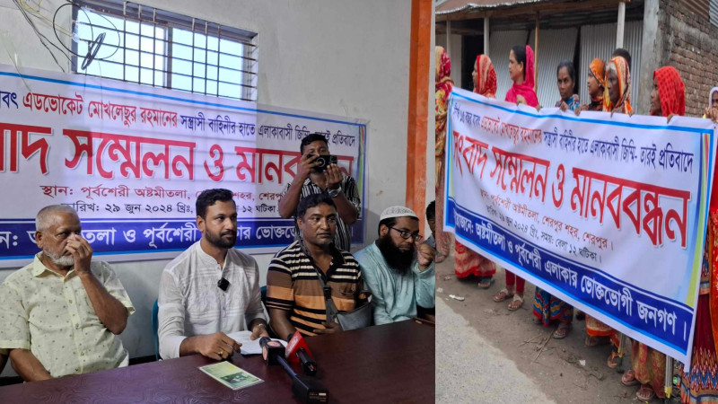 শেরপুরে সন্ত্রাসী বাহিনীর অত্যাচারে অতিষ্ঠ হয়ে এলাকাবাসীর মানববন্ধন ও সংবাদ সম্মেলন