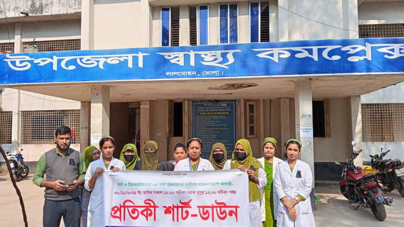 লালমোহন হাসপাতালে ৮ দফা দাবিতে নার্সদের প্রতিকী শাট-ডাউন